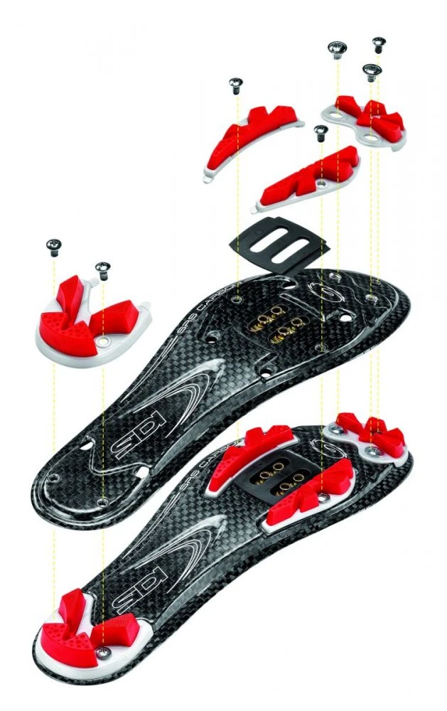 Professional racing shoes with carbon sole, unique patented Tecno 3 fastening system and retractable heel. Removable Sidi SRS sole system.